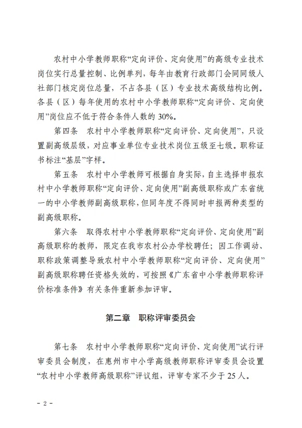 农村中小学教师职称“定向评价、定向使用”,只设置副高级层级,对应事业单位专业技术岗位五级至七级。职称证书标注“基层”字样。取得农村中小学教师职称“定向评价、定向使用”副高级职称的教师,限定在惠州农村公办学校聘任。