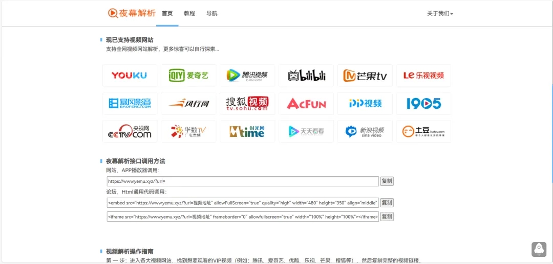 支持国内众多网站视频解析下载。比如优酷、爱奇艺、腾讯、芒果、乐视、搜狐、MP4、M3U8、FLV等等。网站主要提供VIP视频解析服务,包括但不限于VIP视频在线解析、VIP解析、万能VIP视频解析、VIP视频全能解析等功能。具体支持的视频平台包括优酷、爱奇艺、腾讯、乐视、芒果等网站界面简洁,没有广告。