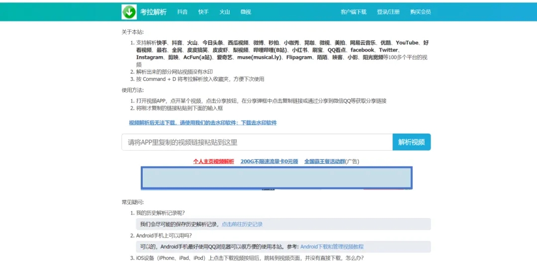 一个在线短视频解析下载网站它专注于短视频平台无水印视频下载。支持:抖音、快手、火山、西瓜、头条、微视、皮皮虾、TikTok、最右、微博等100多个平台的水印获取无水印视频链接