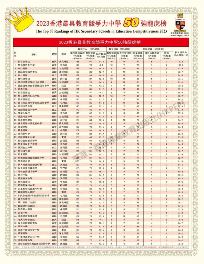 排名数据来源于香港专业教育出版社(HKPEP),根据学年报告、教育局视学报告及校外评核报告、大样本(各学校家长、老师和学生各层面问卷调查的统计分析)等,得出【2023香港最具教育競爭力中學50強龍虎榜】,仅供参考!