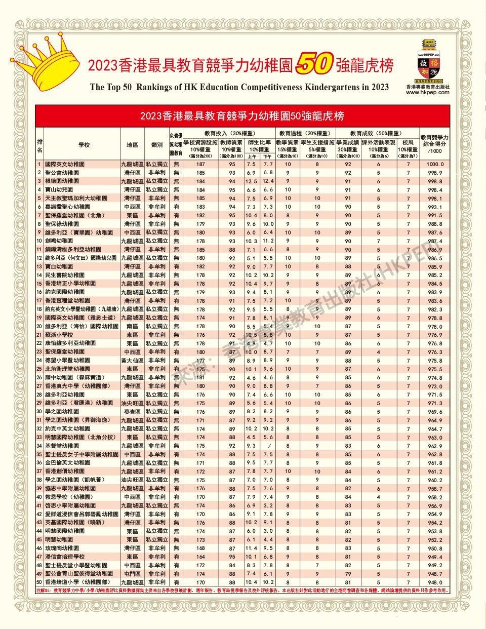 排名数据来源于香港专业教育出版社(HKPEP),根据学年报告、教育局视学报告及校外评核报告、大样本(各学校家长、老师和学生各层面问卷调查的统计分析)等,得出【2023香港最具教育競爭力幼稚園50強龍虎榜】,仅供参考!