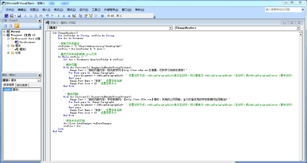 5、根据你的需求修改代码,例如更改文件夹路径、页眉和页脚内容。对齐方式、字体、字体大小。