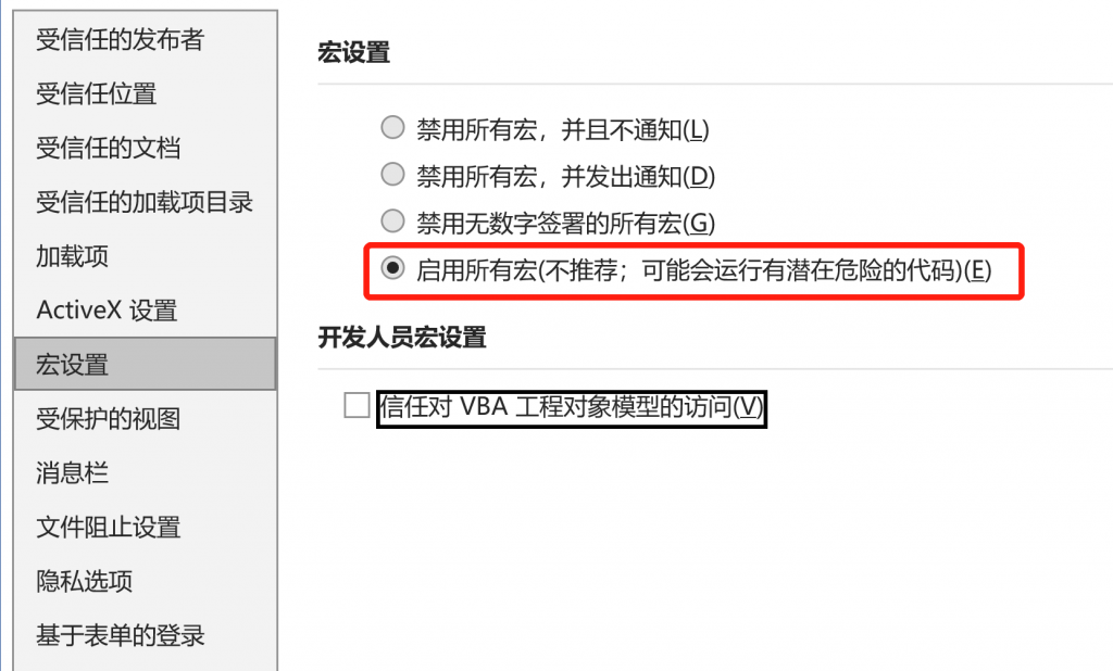 7、运行后,没有生效,可能原因如下:(1)本地文件夹的路径没填对,我自己第一次运行的时候,少了最后面的“\”(2)word中需要启动宏,操作如下:“文件->开始->选项->信任中心->信任中心设置”