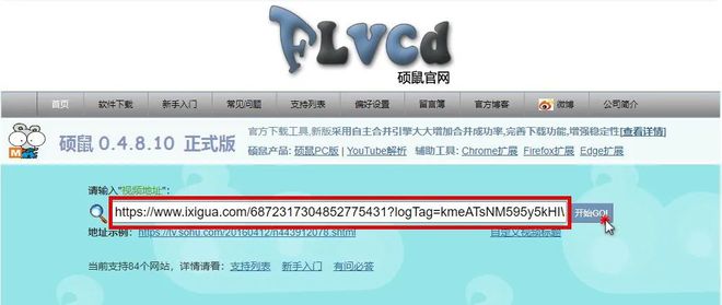 打开网站首页(硕鼠),将西瓜视频播放页地址,粘贴到文本框,然后点击后面的“开始GO”