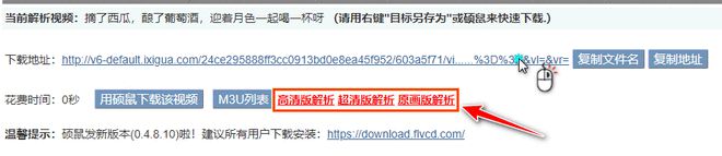 停一会网站就能解析出视频地址,默认的应该是低画质。如果需要高画质,你可以选择高清画质解析,这时网站会再次解析,获得高清地址。