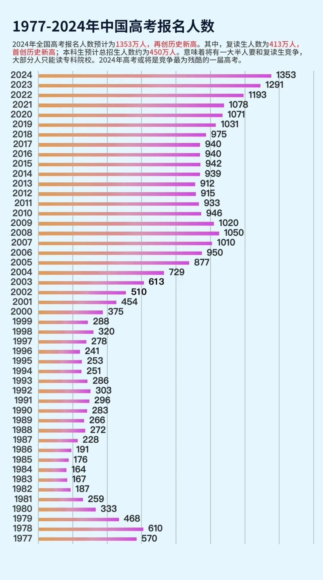 根据网上公布的数据显示:2024年全国高考报名人数为1353万,比2023年多出62万人,再次创下历史新高!
