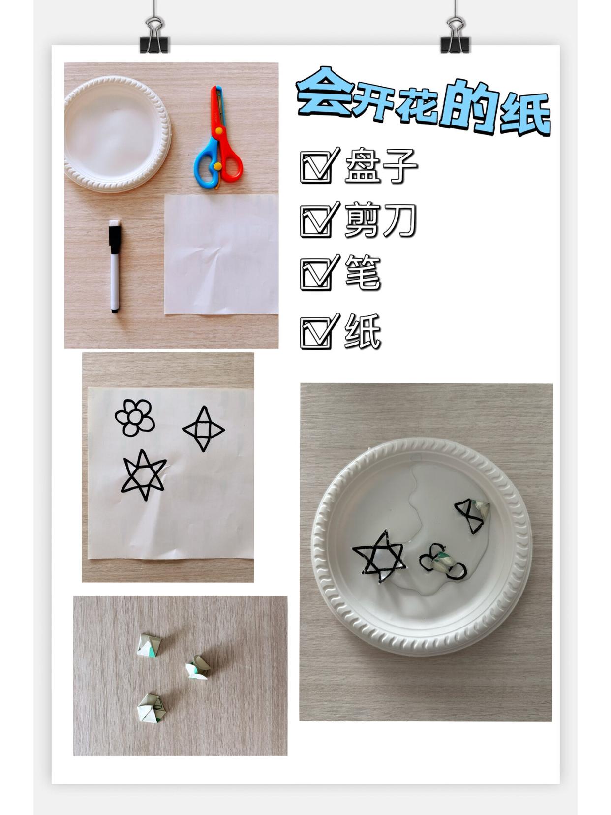 材料:纸、笔、剪刀、盘子、水
