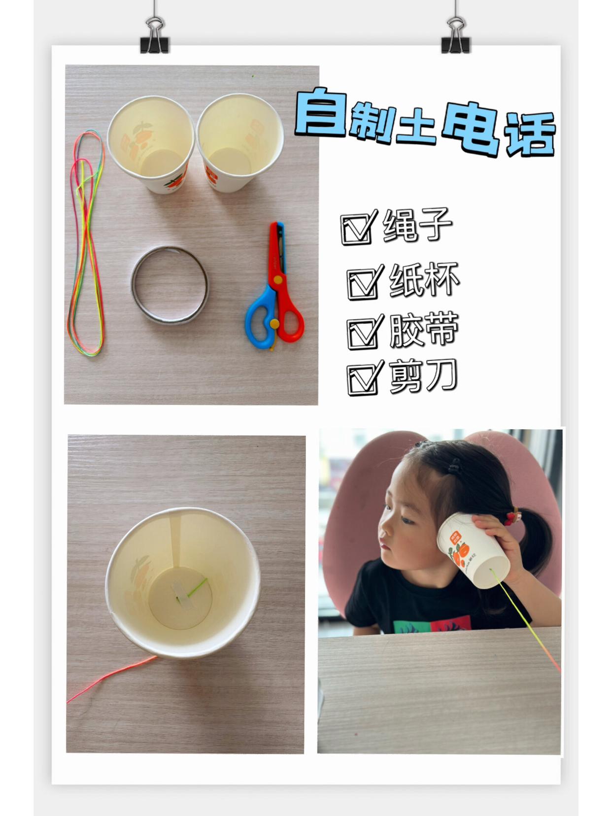 材料:两个纸杯、线、胶带、剪刀