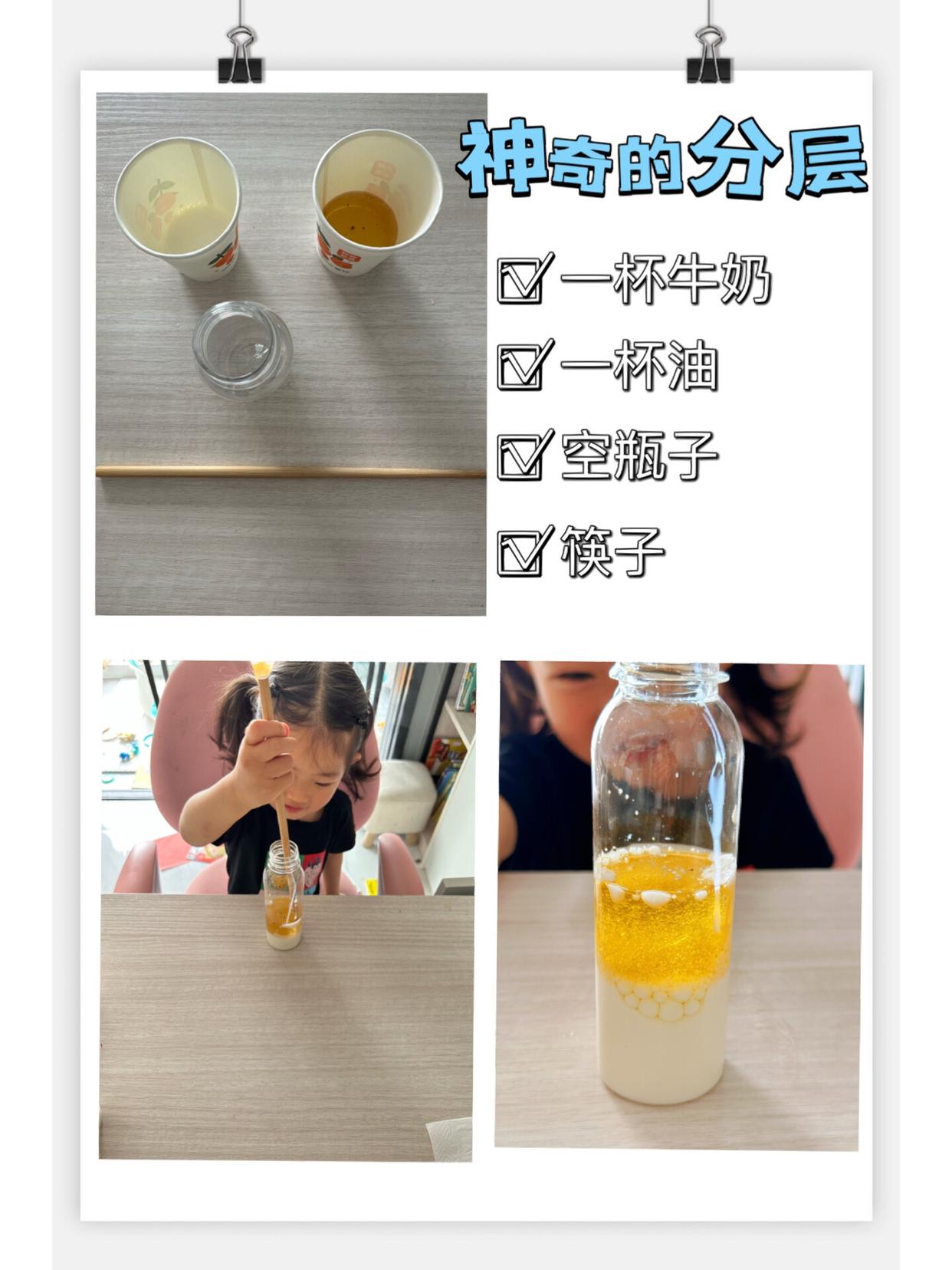 步骤:将牛奶和油依次倒入空瓶子中,并用筷子搅动。不管怎么搅,牛奶和油始终分离,出现分层。