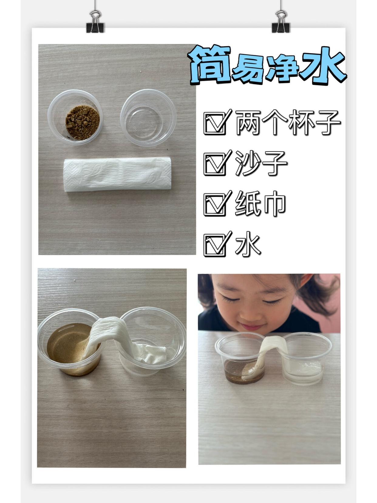 步骤:杯中倒进沙子和水,水变浑浊,纸巾对折如图,把纸巾一端放在装有浑浊水的杯子,另一端放在空杯子中。放置一段时间后,空杯子中出现了干净的水。