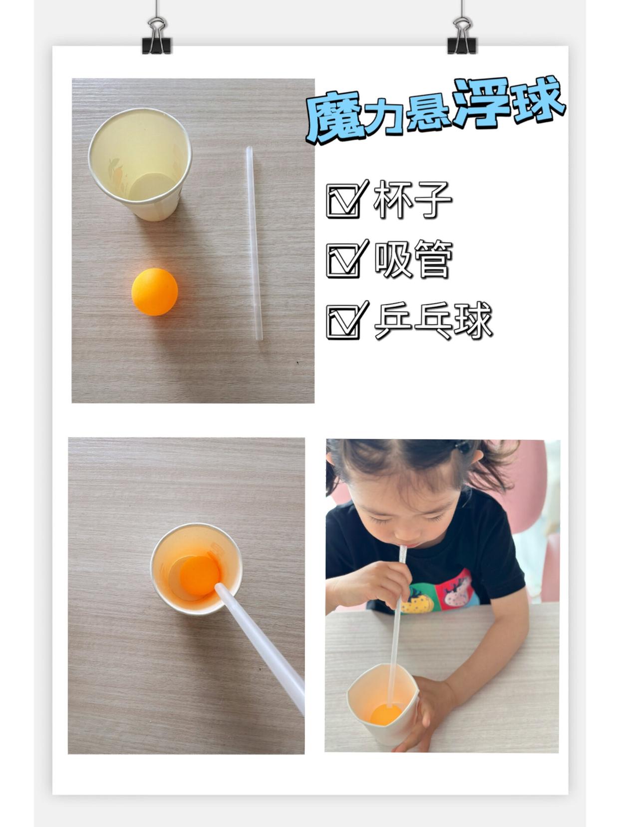 步骤:乒乓球放入纸杯,用吸管向杯子内吹气,乒乓球跳起