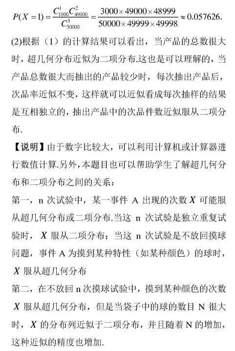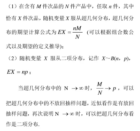 (1) 超几何分布描述的是不放回抽样问题,而二项分布描述的是放回抽样问题.