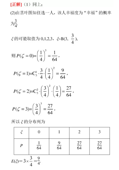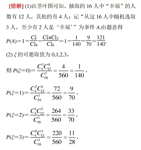 [错解分析]第二问的选人问题是不放回抽样问题, 按照定义先考虑超几何分布,但是题目中又明确给出:“以这16人的样本数据来估计整个社区的总体数据,从该社区(人数很多)任选3人”,说明不是从16人中任选3人,而是从该社区(人数很多)任选3人,所以可以近似看作是3次独立重复试验,应该按照二项分布去求解,而不能按照超几何分布去处理.