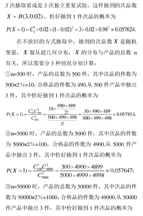 从以上分析可以看出两者之间的联系:当调查研究的样本容量非常大时,在有放回地抽取与无放回地抽取条件下,计算得到的概率非常接近,可以近似把超几何分布认为是二项分布.