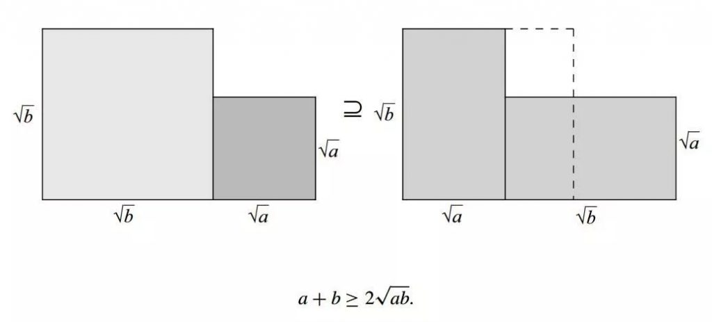 不同于代数的抽象性,这种仅用图形加少量文字的证明方法让学生会有一种非常直观的感觉,或者说有一种简单粗暴的美学体验,帮助学生对纯代数的证明有更好的理解。