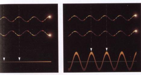 虽然光是由波组成的,普郎克的量子假设告诉我们,在某些方面,它的行为似乎显现出它是由粒子组成的——它只能以量子的形式被发射或吸收。同样地,海森堡的不确定性原理意味着,粒子在某些方面的行为像波一样:它们没有确定的位置,而是被“抹平”成一定的几率分布。量子力学的理论是基于一个全新的数学基础之上,不再按照粒子和波动来描述实际的世界;而只不过利用这些术语,来描述对世界的观测而已。所以,在量子力学中存在着波动和粒子的二重性:为了某些目的将波动想像成为粒子是有助的,反之亦然。这导致一个很重要的后果,人们可以观察到两组波或粒子的所谓的干涉,也就是一束波的波峰可以和另一束波的波谷相重合。这两束波互相抵消,而不是像人们预料的那样,迭加在一起形成更强的波(图 4.1)。一个熟知的光的干涉的例子是,肥皂泡上经常能看到颜色。这是因为从形成泡沫的很薄的水膜的两边反射回来的光互相干涉而引起的。白光含有所有不同波长或颜色的光波,从水膜一边反射回来的具有一定波长的波的波峰和从另一边反射的波谷相重合时,对应于此波长的颜色就不在反射光中出现,所以反射光就显得五彩缤纷。