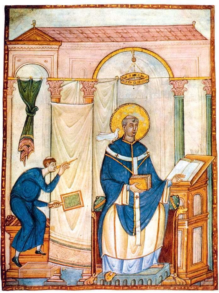 图28 教皇格雷戈里一世谱出了以他为名的格雷戈里圣歌。圣灵仍以最爱的鸽子形象出现,站在他的右肩上,在他耳边低语。圣灵才是圣歌的真正作者,格雷戈里只是一个传声筒,上帝才是艺术和美丽的本源