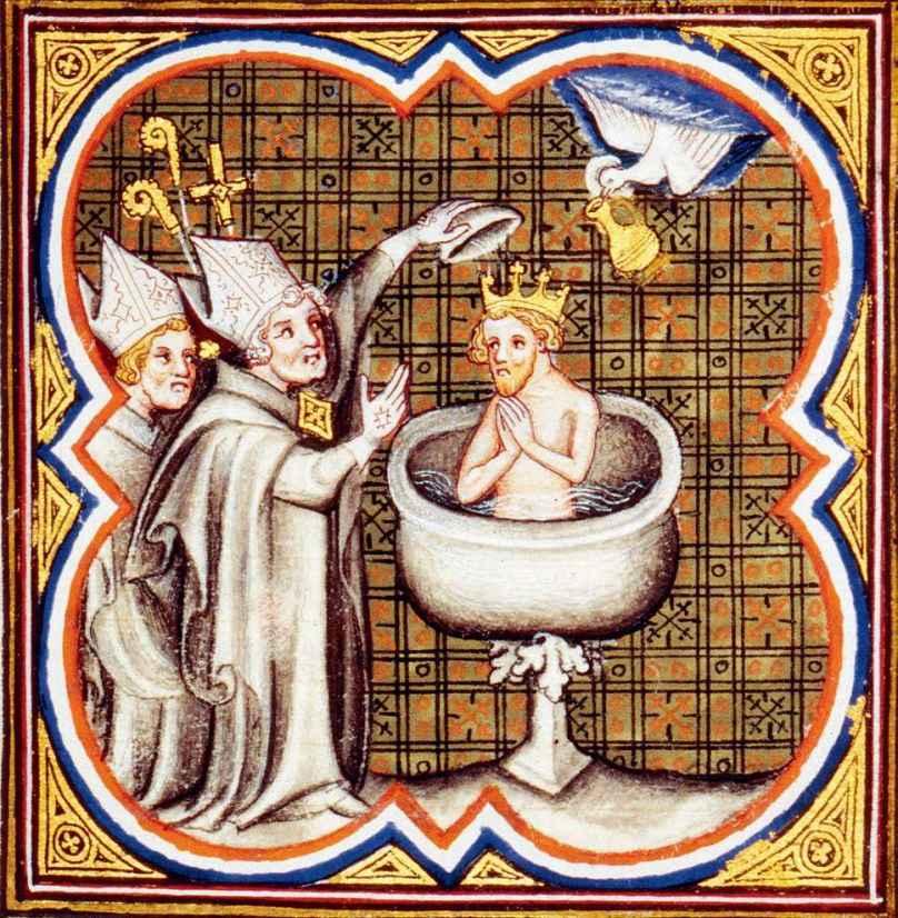 图27 圣灵以鸽子的形象出现,送来装满圣油的壶,好为法兰克王国创始人克洛维国王(King Clovis)施洗(图片出自约1380年的《法兰西大编年史》)。根据法国的建国神话,这个壶之后保存在兰斯大教堂(Rheims Cathedral),继任的法国国王加冕也都要涂圣油。每次要加冕时,这个壶都会自动重新添满,因此每次加冕都是一项奇迹,显示上帝自己选定了这位国王并给予祝福。如果上帝不希望路易十世、路易十四或路易十六成为国王,这个壶就不会重新添满