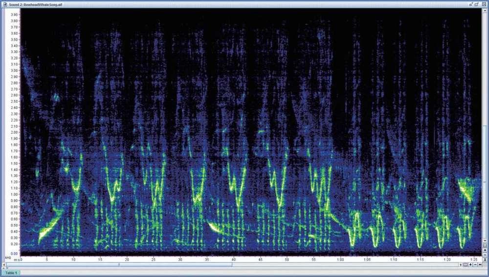 图47 一首座头鲸歌曲的声谱图。鲸鱼对这首歌有怎样的感受?原声带专辑《旅行者》中除了贝多芬、巴赫和查克·贝里之外,也录了一首鲸鱼歌,但我们只能希望这头鲸鱼真的唱得不错