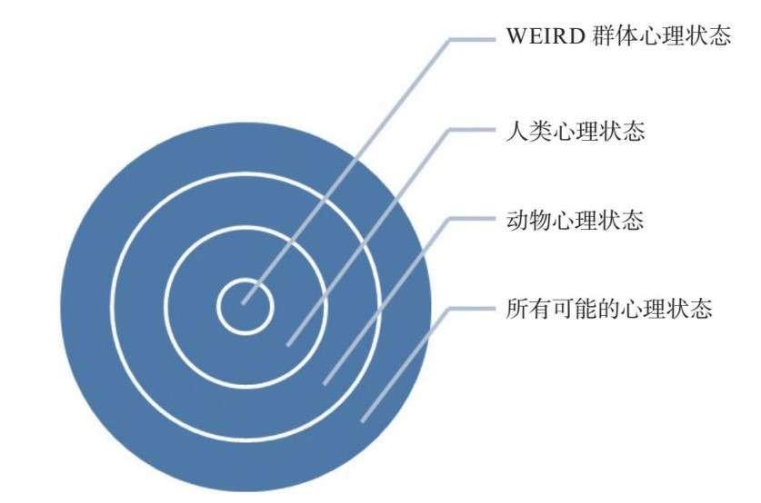 真正的光谱和声谱范围,都比人类能看到和听到的更为宽泛;同样,心理状态的频谱也可能远大于普通人的感知。人类肉眼只能看到波长在400纳米到700纳米之间的光,而在人眼这个小小的视觉范围之外,还延伸出许多不可见的广大领域,波长更长的有红外线、微波、无线电波,更短的则有紫外线、X射线和γ射线等。同样,心理状态的频谱可能无限延伸,但科学目前还只研究了其中两小部分:次规范群体(sub-normative),以及WEIRD(western, educated, industrialised, rich, and democratic,即来自西方、受过教育、工业化、富裕、民主)群体。