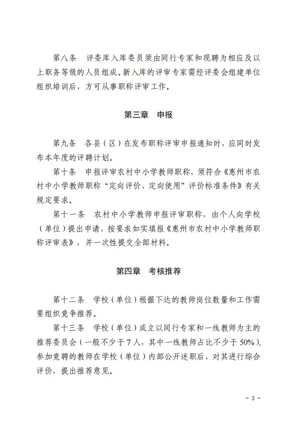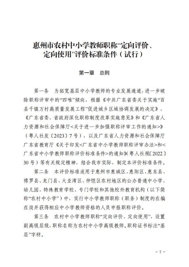 根据《中共广东省委关于实施百县千镇万村高质量发展工程”促进城乡区域协调发展的决定》《关于进一步做好职称评审工作通知》(粤人社发〔2023〕7 号)等文件精神,为进一步拓宽我市农村中小学教师的专业发展通道,鼓励和引导中小学教师扎根基层、服务基层,推动人才向基层流动。结合我市实际,制定了《惠州市农村中小学教师职称“定向评价、定向使用”评审办法(试行)》《惠州市农村中小学教师职称“定向评价、定向使用”评价标准条件(试行)》,现印发给你们。