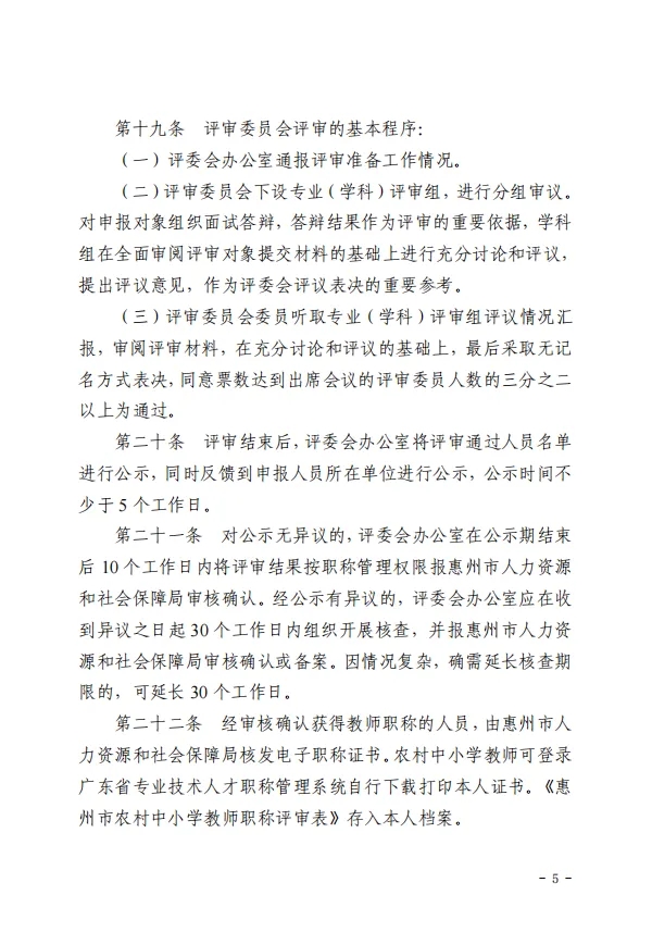 农村中小学教师职称“定向评价、定向使用”,只设置副高级层级,对应事业单位专业技术岗位五级至七级。职称证书标注“基层”字样。取得农村中小学教师职称“定向评价、定向使用”副高级职称的教师,限定在惠州农村公办学校聘任。