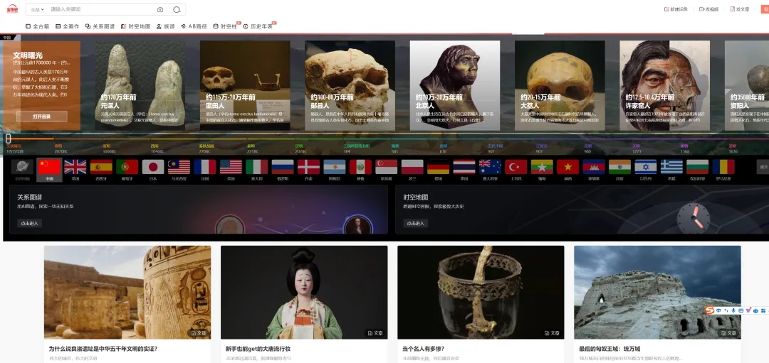 官网首页视觉呈现特别丰富,由上至下功能分区依次是:国家历史时间轴、关系地图、时空地图、文章、画作、往期专题。具体目录里又会细分到政治、经济、科技、社会、文化、军事,也可以自行新建未有条目,极具参与感。