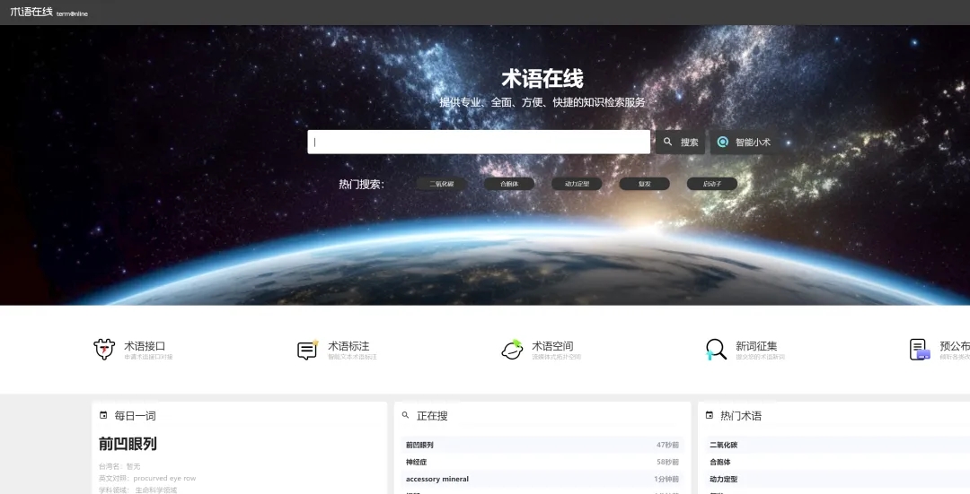 术语在线是由全国科学技术名词审定委员会打造的互联网知识服务平台,提供术语检索、术语管理(纠错、征集、分享)、术语提取与标注、术语校对等服务。包含了全国科技名词委发布的规范名词数据库、名词对照数据库,以及工具书数据库等资源,累计50万余条规范术语,范围覆盖自然科学、工程与技术科学、医学与生命科学、人文社会科学、军事科学等学科领域。
