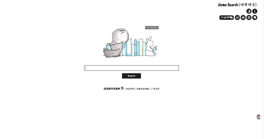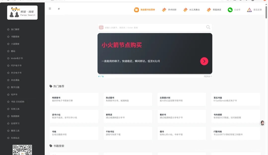 非常好用的电子书资源集成导航网站,同样收集有市面上大部分书籍。网站导航界面内,像是我们上面提到的z-library、鸠摩搜书、苦瓜书盘都有收录在内,如果上面的网站崩了,可以立刻来熊猫这里找备份。不过,里面小广告相比上面的网站而言属于比较多的了。在一开始进入这个网站时,它可能会提醒你充值或者购买梯子以方便继续使用,但我的使用感受下,我觉得完全没有必要,直接点击导航界面,导航去上面的任一网站就好。个人觉得这个网站的搜索辅助功能是大于它本身的搜书功能的。适合在上面的网站打不开时应急使用。