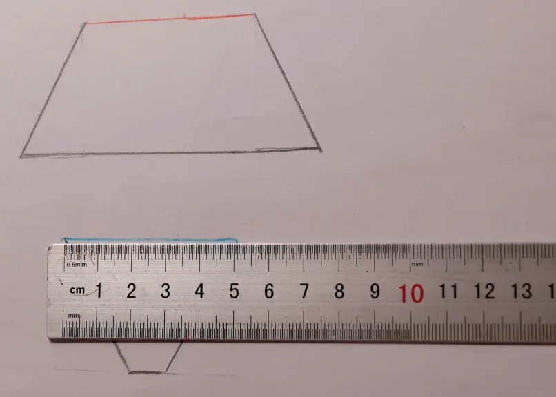 第一步:用三角尺辅助直尺,在白纸上画一个等腰梯形(短边朝上),再用红笔把短边瞄成红色。