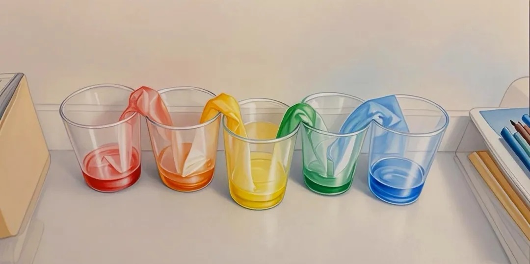 这到底是为什么呢?我好奇极了,赶紧翻书去查阅资料。原来红黄溶液顺着纸巾流到了第二个杯子里,而红色加上黄色刚好能生成橙色;黄蓝溶液顺着纸巾流到了第四个杯子里,黄色加上蓝色就生成了绿色。这其实是一种毛细现象,就是比我们头发丝还要细小的小细管的吸水现象。