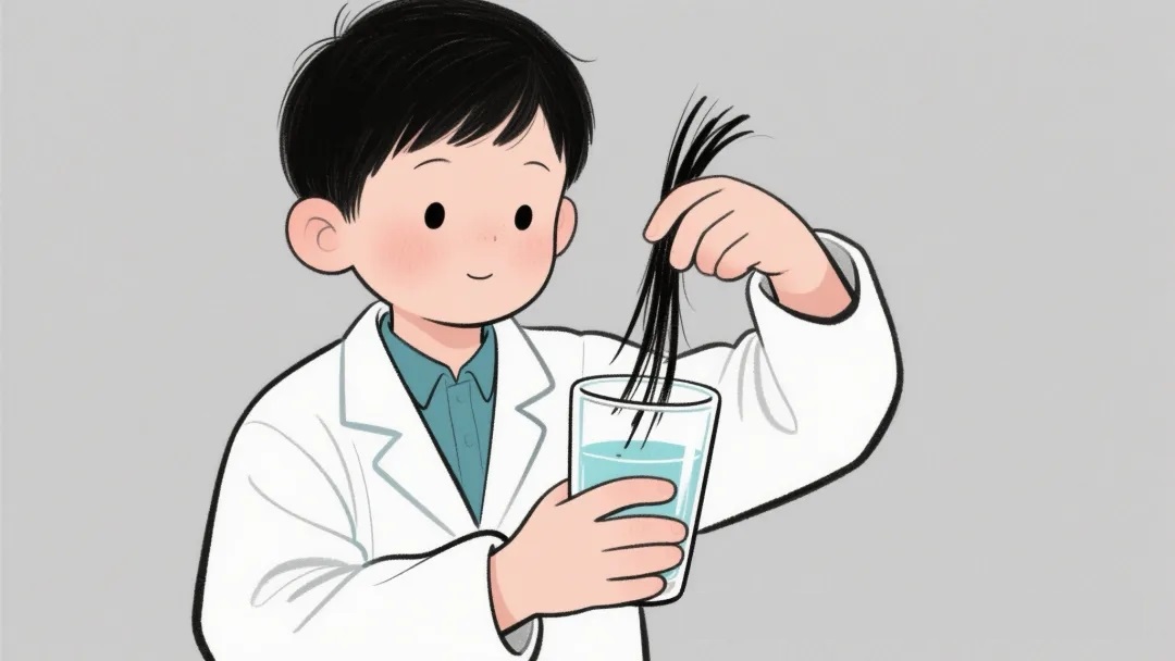 按照实验要求,我得耐心等上一个小时。这一个小时可真难熬啊,我一会儿跑去看看杯子,一会儿又在房间里走来走去,心里不停地想着:头发丝到底什么时候才会消失呢?好不容易熬过了这一个小时,我迫不及待地跑到杯子前。哇!太神奇了!原本还在杯底的头发丝居然真的消失不见了,杯子里只剩下清澈的消毒液,就好像从来没有放过头发一样。