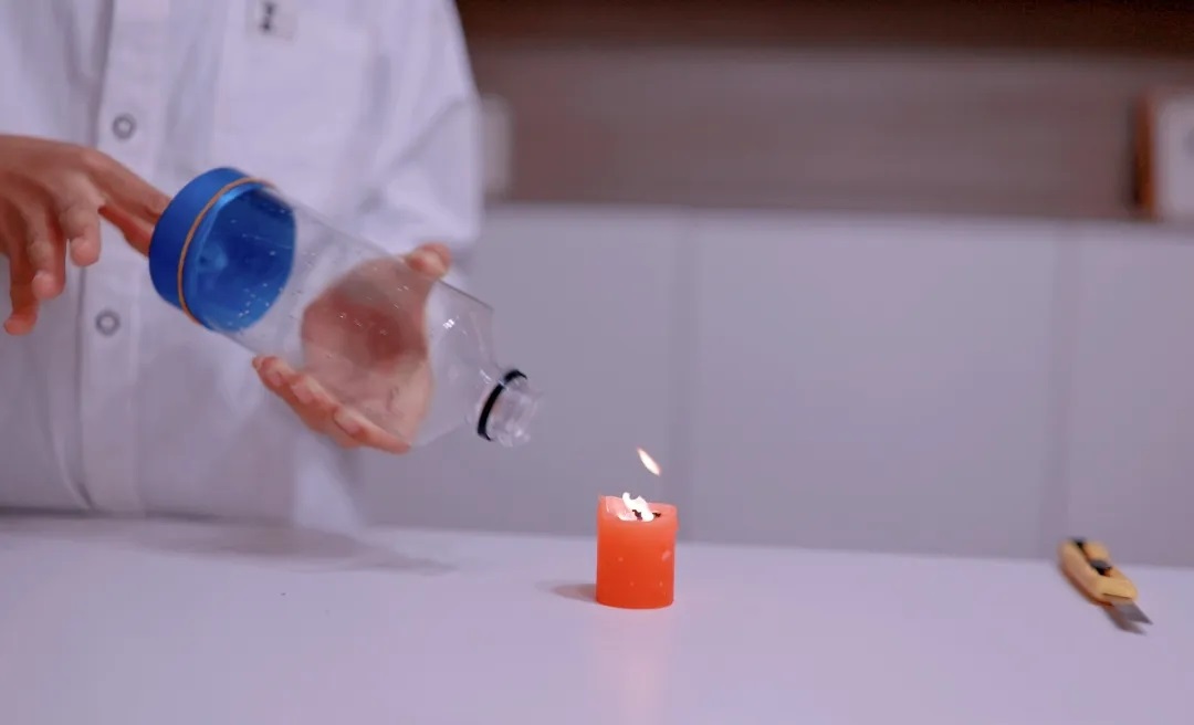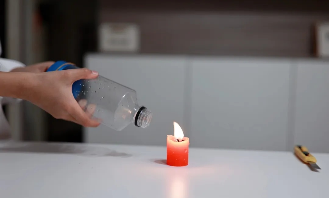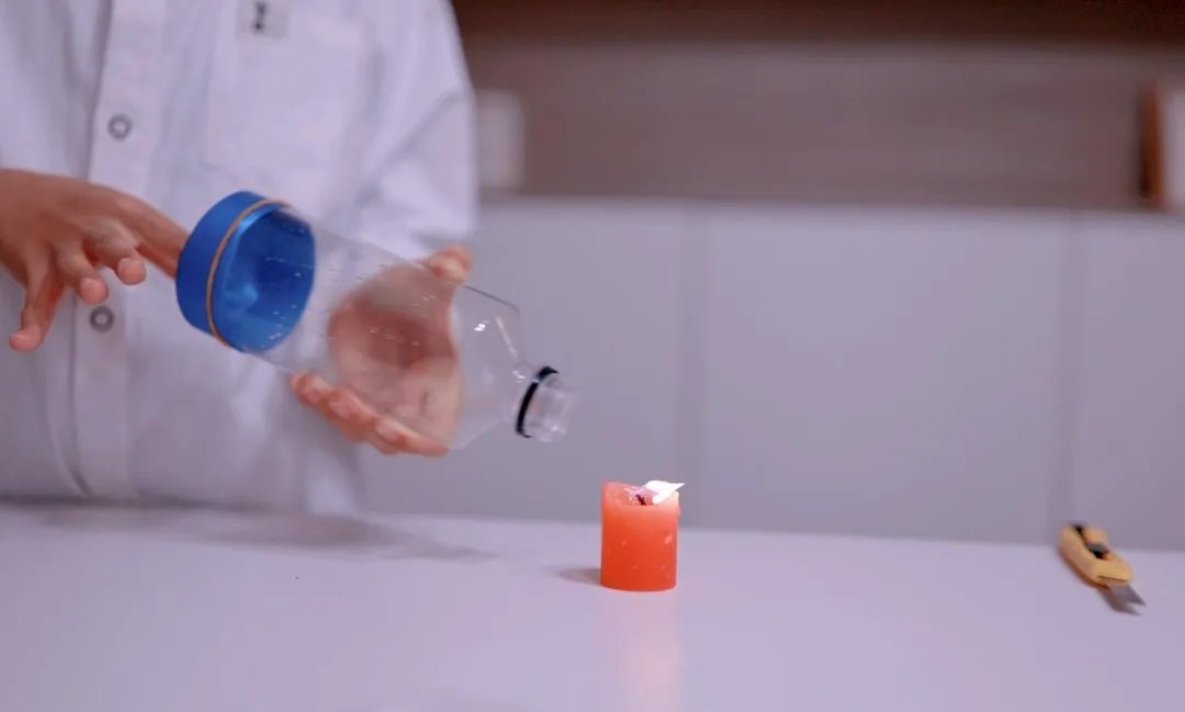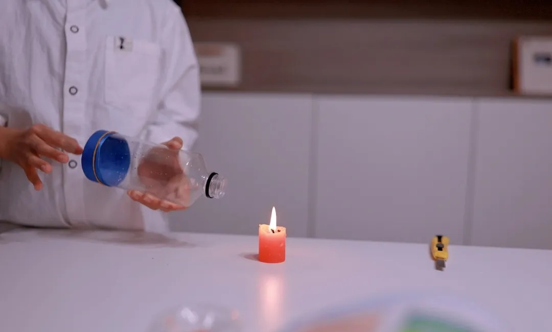 第三步用打火机点燃蜡烛,接着,把矿泉水瓶的瓶口对准燃烧的蜡烛火焰,马上到了见证奇迹的时刻。