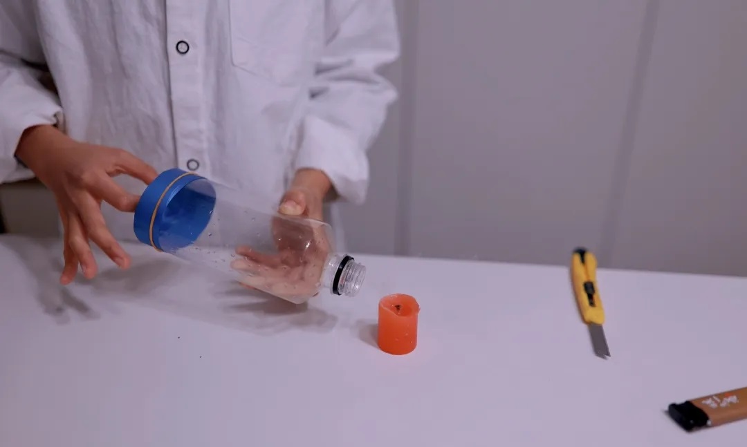 第一步用美工刀小心翼翼地切割掉矿泉水瓶的底部,再把瓶盖拿掉。这一步就像是给瓶子“做手术”,为后续实验做好准备。
